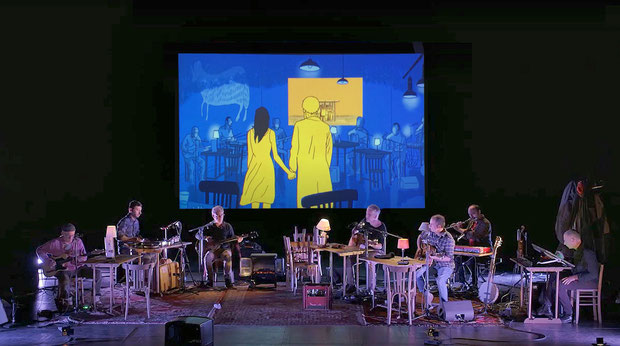 Sur scène, le collectif pop rock bordelais Robert & Mitchum et l’auteur de bande dessinée Christian Durieux conjuguent musique live, dessins en direct et images animées pour donner vie au récit et embarquer le spectateur dans un long rêve sensoriel.
